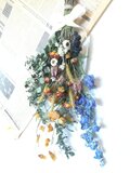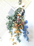 ほおずきに似た揺れる様子が可愛らしいサンダーソニアと、ミニバラ、フーセンポピー、デルフィニウム、アンモビューム、シャリンバイ、などをアレンジしたユーカリがほのかに香るスワッグです。
