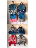 デニムとストライプ合わせのシンプルでお洒落なキッズリュックサックです。肩紐ずり落ち防止のひも付き♬