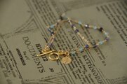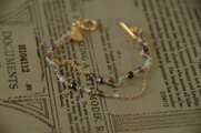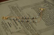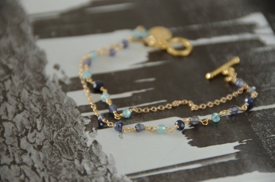 アイオライト、サファイア、ブルーアパタイトとそれぞれ異なる個性の青い石たちを使った作品です。ゴールドカラーのパーツをあわせて、久しぶりに思う存分に青を表現してみました。