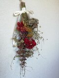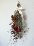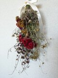 ビロードのような質感のローズ色のケイトウと、ムラサキシキブ、おみなえし、ヒヨドリバナなど秋を沢山束ねたナチュラルなスワッグです。