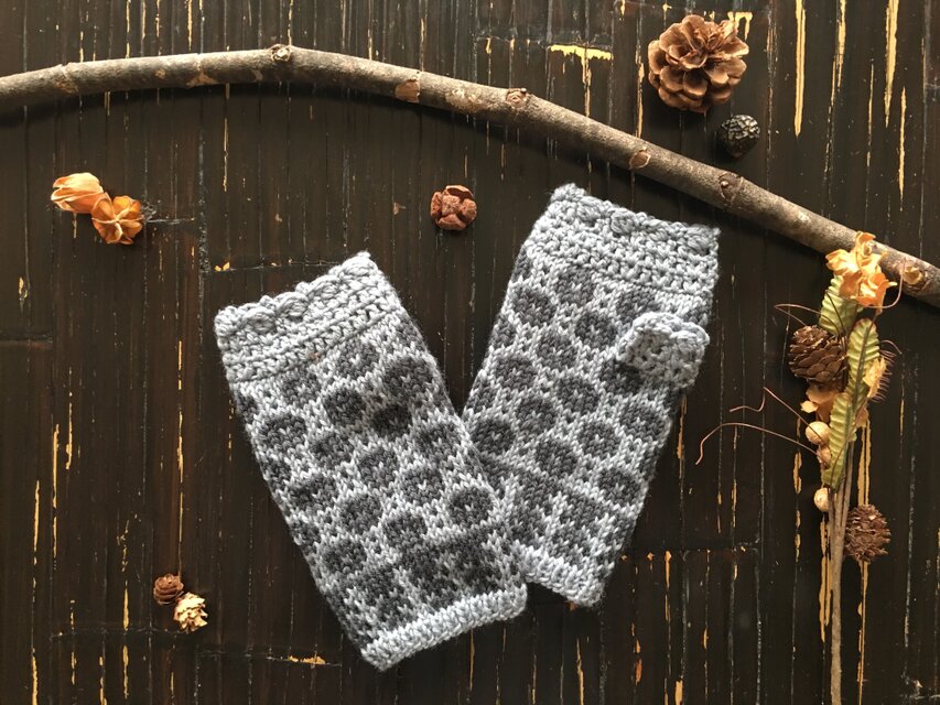 手首部分には色を反転させて木の模様を配し、指部分はかぎ針編みで縁取りを施しています。