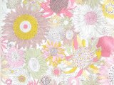 沢山のひまわりが丁寧に描かれています。 生地の地の色がオフホワイト、お花には、ライトピンク、サーモンピンク、イエロー、ライトグリーン、ベージュジなどが配色されています。