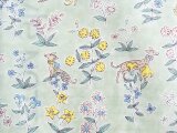 生地の色は地の色が、少し濃淡のあるライトグリーン、花の色にブルー、イエロー、ライトピンク、ホワイトなど、動物の色にグレージュ、イエローなどが使われています。
