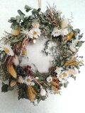 シルバーカラーの爽やかな香りのユーカリと、ロマンチックで可愛らしい白いお花のローダンセ、ラグラス、アンモビュムなどをアレンジしたシンプルでナチュラルなリースです。