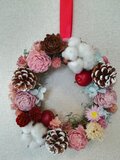 秋の実、綿の実、ソーラーローズ、センニチコウ、姫カイザイクなどをアレンジしたクリスマスリースです。