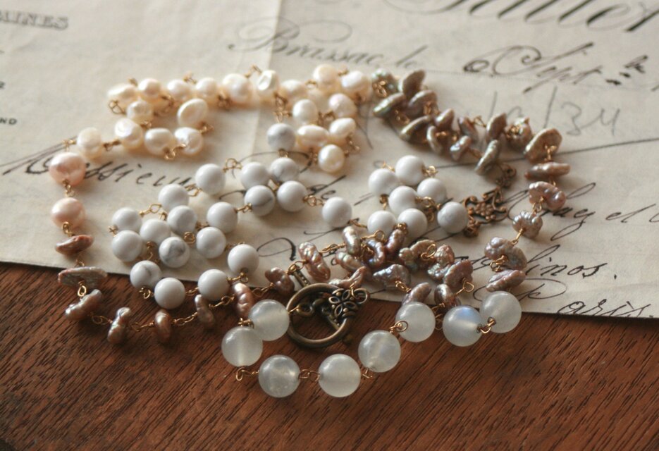 天然石マグネサイトと2種類の淡水パール、水晶のロングネックレスです。