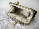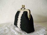 黒リネンにアンティークレースをのせたがま口ポーチ