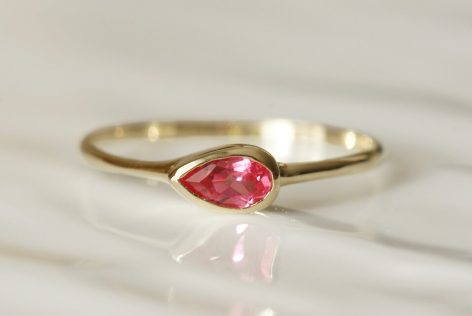 少し細長いペアシェイプ(しずく)のスピネルを使用したリングです。