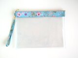 リバティの人気生地(ラミネートつや無)、イルマ Irma(水色とピンク)で中身が見えるクリアポーチを作りました。