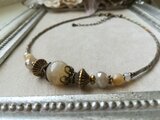 ネック部分は、ガラス製のツイストビーズ(棒状のビーズ)を、しなやかで張りのある太目のナイロンコートワイヤーに通していますので、円の状態でお付けできます。