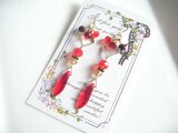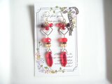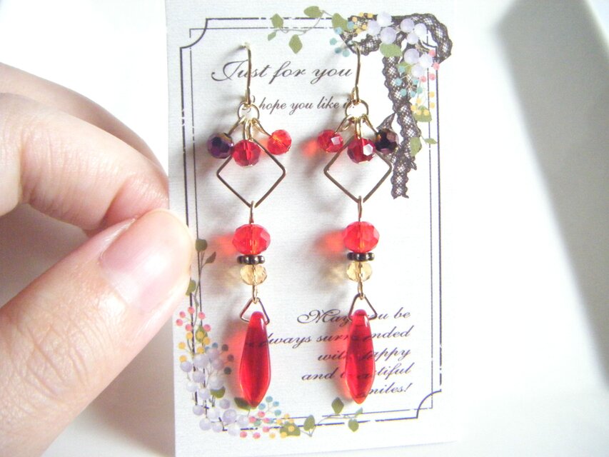 シャープな形が素敵なライトシャム色のチェコタガービーズをメインにスクエアフープやガラスビーズを合わせたお洒落なロングピアスとなっております♪