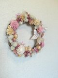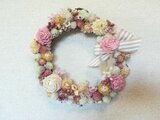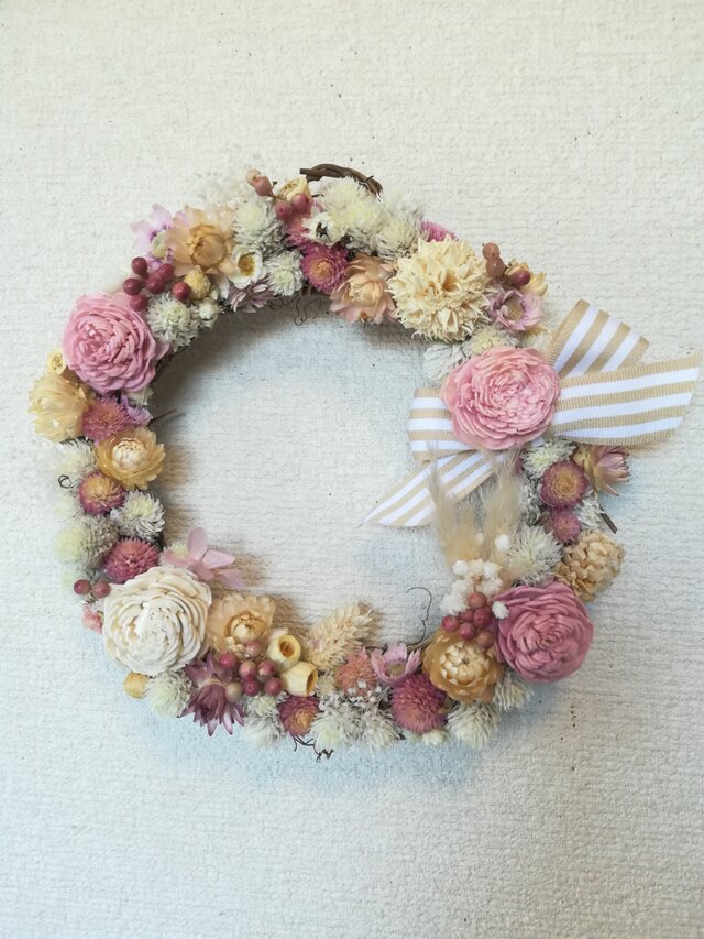 ピンク、ホワイトのソーラーローズと、センニチソウ、ペッパーベリー、カスミソウ、実などをアレンジした淡い色合いのナチュラルなリースです。