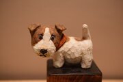 クスノキで彫ったジャックラッセルテリアの仔犬きょとんくんです。