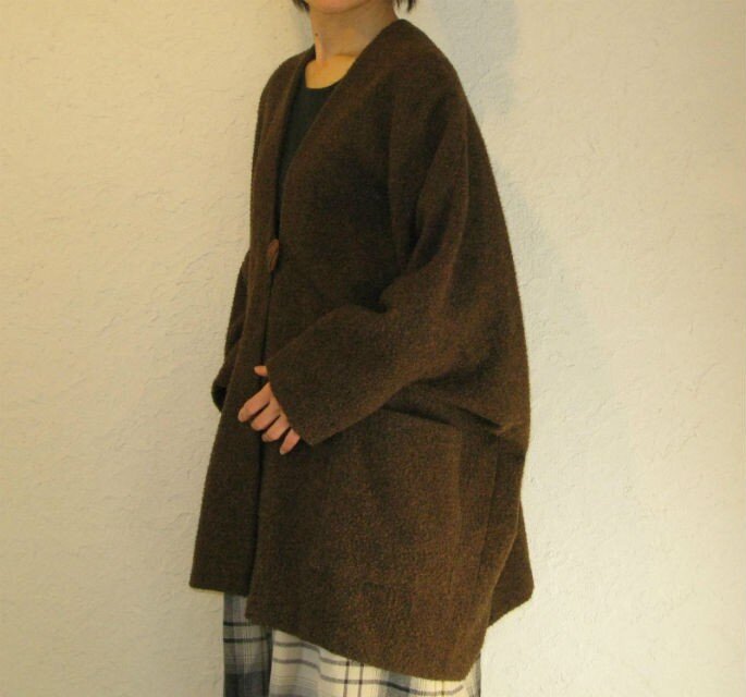 ツイード地を起毛してネップを出した、ふっくら柔らかなウールで仕立てた単衣のハーフコートです。たっぷりとした変形シルエットです。生地のボリュームの割に軽く肩のこらない素材です。