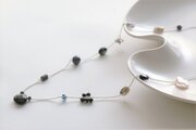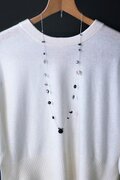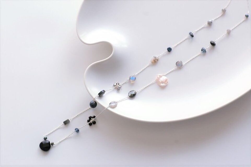 モノトーンの石やパーツをリズミカルにチェーンで繋いだロングネックレスです。