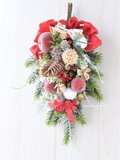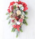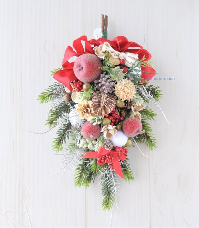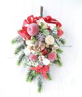 サイズ(最大の部分 縦・横・高さ 約㎝)34.5/24/11 素材:アーティフィシャルフラワ-(造花):コニファー・シュガーアップル・木の実・小さな赤い実・ホップ、など。自然素材:トーヒハーフ・松かさ・ワタカラ・カラマツ・アンバーバーム、など。その他:赤のリボン飾り(取り外しできません)・スノーボール・小さなリボン飾り、など。