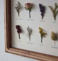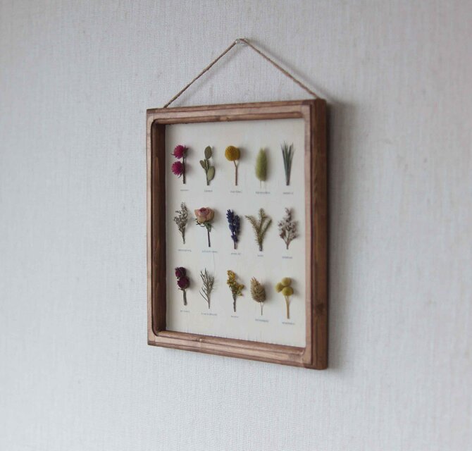 アンティーク調に仕上げた自家製フレームにドライフラワーを貼り付けました。