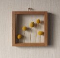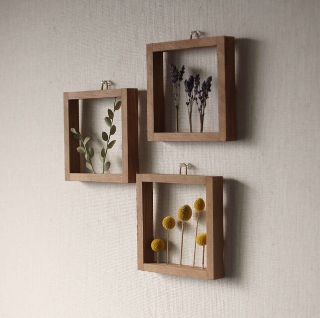 アンティーク調に仕上げた自家製フレームにドライフラワーやプリザーブドフラワーなどをはめこみました。