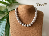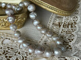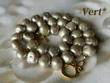 アイボリーやベージュ系の色味を含んだ、シルバーがかった品の良いレアカラーの大粒バロックパールを、ひと粒ごとにベージュのグリフィンコードで結び留めたオールノット仕立てのショートネックレスです。ほとんどの粒が約9~12mmと大きめですので存在感があります。