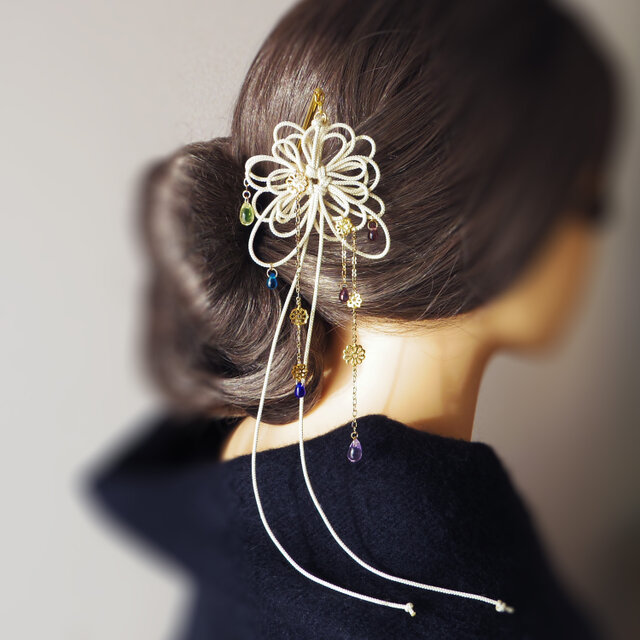 ※かんざしは「軸」を持つようにしてください。飾りを掴まないようにお願いいたします。特に「ひねる」方向には大変弱いです。