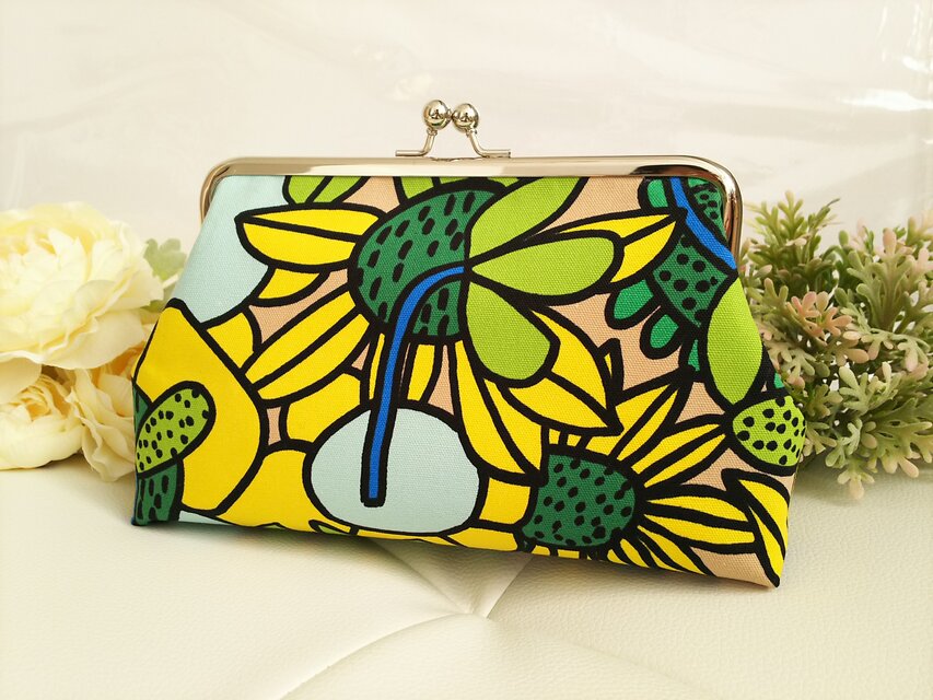 縁取りフラワーがインパクトあるがま口ポーチのご紹介でございます(^-^)