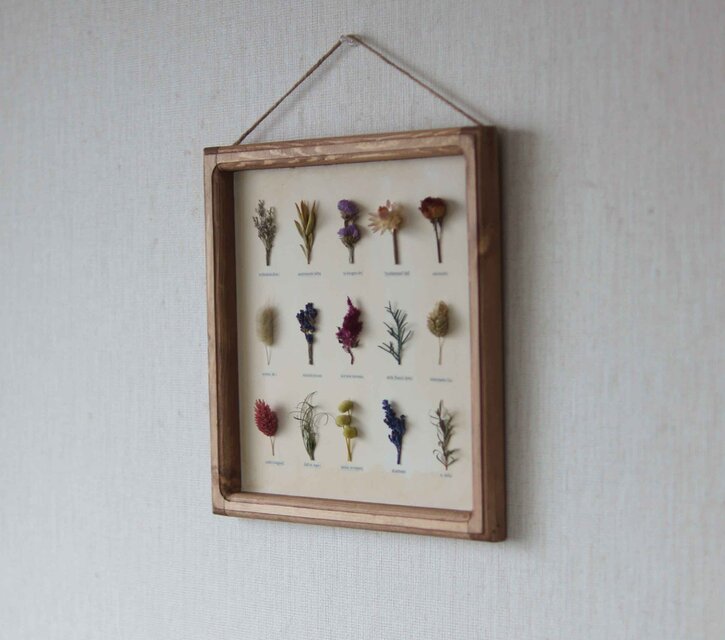 アンティーク調に仕上げた自家製フレームにドライフラワーを貼り付けました。