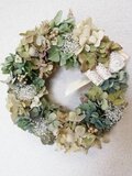 ブルー、グリーン、パープル、ベージュなどの味わいのある色合いのあじさいと、カスミソウ、センニチコウなどのシンプルでナチュラルなリースです。