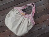 四角い一枚布のふちを手縫いで絞り、その縫い目から目を編み出して取っ手を作ってありますので、丈夫です。