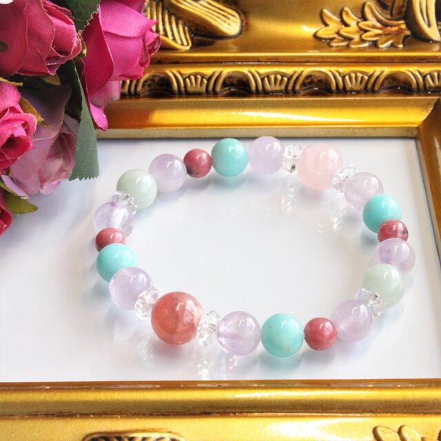 濃い薔薇色の上質なインカローズのブレスレットです。ローズクォーツやラベンダーアメジスト、アマゾナイトなど彩り豊かにあしらい、華やかでエレガントな雰囲気です。