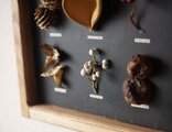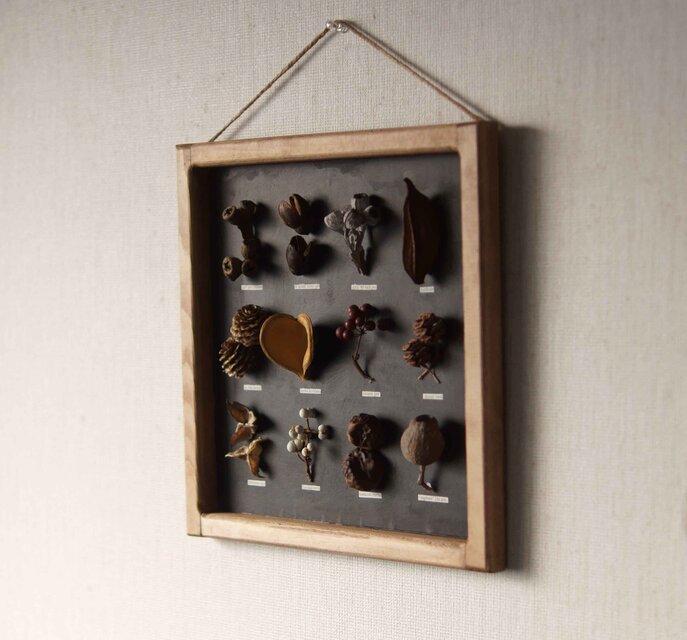 アンティーク調に仕上げた自家製フレームに木の実をメインに貼り付けました。