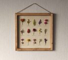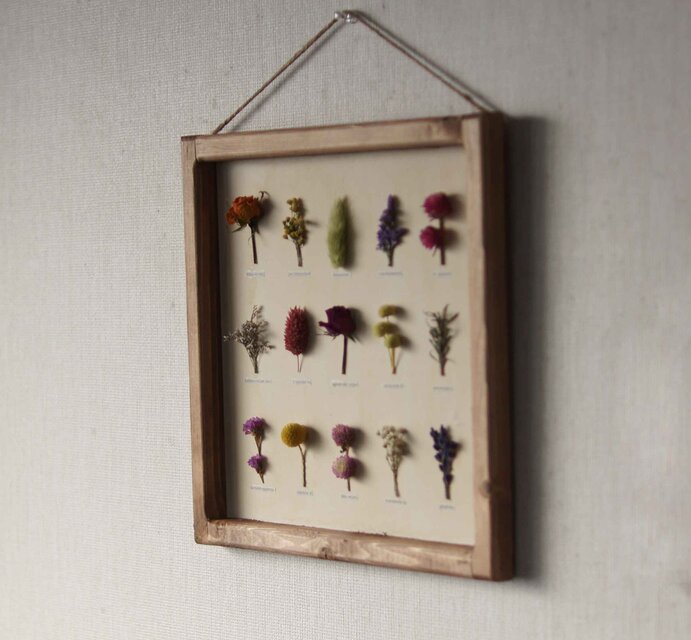 アンティーク調に仕上げた自家製フレームにドライフラワーを貼り付けました。