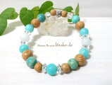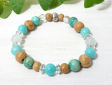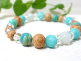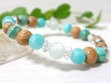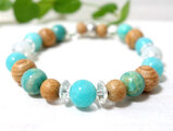 屋久杉のビーズをアクセントに、鮮やかなブルーグリーンに浮かぶ模様がまるで地球や絵画を眺めているような気分になるブルーオパール、 ブルーグリーンの濃い色合いが楽しめるトップクラスのアマゾナイト、神秘的なシラーが美しい上質なホワイトムーンストーンを組み合わせた天然石ブレスレットです。