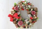 リース素材:アーティフィシャルフラワ-(造花):コニファー・シュガーアップル・くるみ・銀杏・ルージュベリー、など。自然素材:松かさ・トーヒハーフ・ワタカラ・カラマツ・アンバーバーム・スターアニス、など。その他:赤いリボン飾り(取り外しできます)、など。