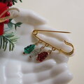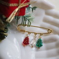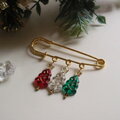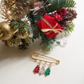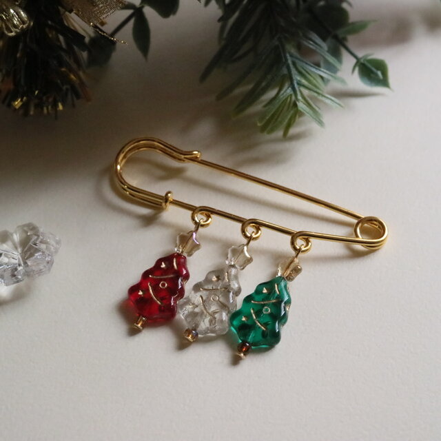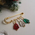 クリスマスツリーの形をしたチェコビーズで、赤・緑・透明のクリスマスカラーのものを3つ並べたストールピンです。