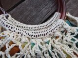 ぱっと見は、何気ないバックですが、いっぱい入れるとバルーンみたいにまん丸くなって可愛いです。 縫い目がないので強度も強そう。 何より、間口のとこのヒダを寄せてある縫い目から糸を拾って編んであるとこが、絶妙です。 私は、こういう作家さんのこだわりが大好きでして。 長いこと何故か売れ残っていた、このバックにご縁を感じ、愛しいです。 「糸あそび」の名のごとく、これからも、わざを見せてください。