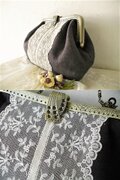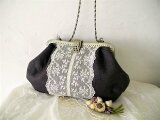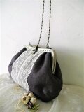 ダークブラウンに近いシックな色合のパープルリネンにアンティークチュールレースをのせたがま口バッグ