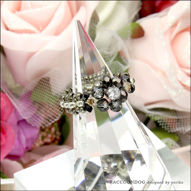 ゴシック・ブラックフラワーリング【スワロフスキー&ジルコニア ビーズリング】《ビーズアクセサリー》