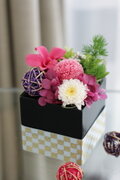 市松模様のリボンを巻いた木製の花器に、ピンクのピンポンマムをメインにアレンジ。