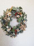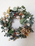 ロマンチックな白いお花のローダンセ、ばらの実、あじさいなどをアレンジしたユーカリがほのかに香るシンプルでナチュラルなリースです。