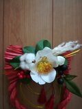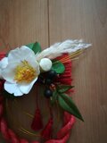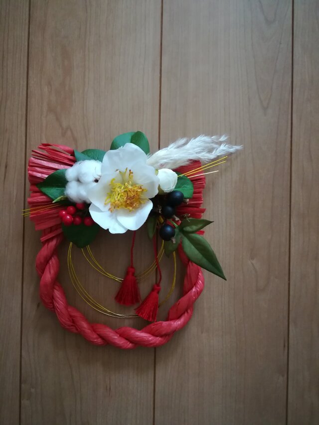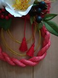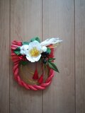 朱色のしめ縄に白椿を使用したしめ縄リースです。