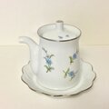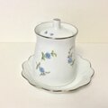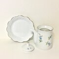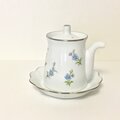 プラチナの縁と清楚なブルーの花が、真っ白な白磁に映えて、和風洋風どちらのテーブルにも合います。