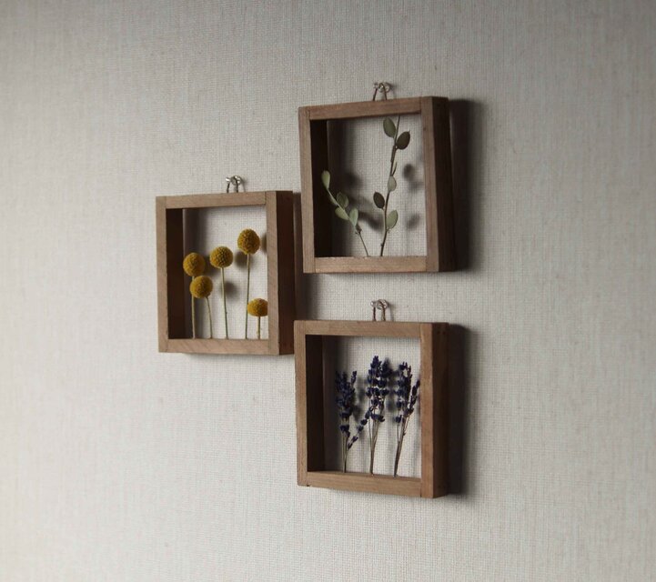 アンティーク調に仕上げた自家製フレームにドライフラワーやプリザーブドフラワーなどをはめこみました。