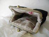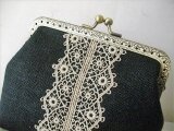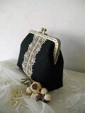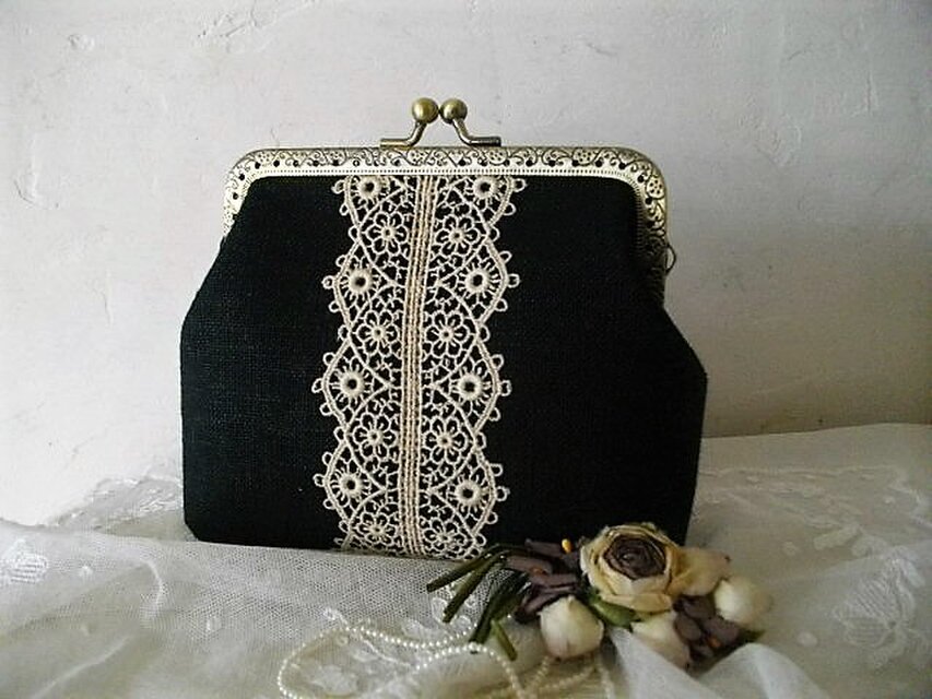 黒リネンにアンティークレースをのせたがま口ポーチ