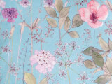 ユーフォルビア、ポピー、アストランティア、イベリスなどの花々のスケッチを、筆づかいや鉛筆のラインまで繊細に表現した素敵な柄です。生地の地の色が水色、花の色がピンク、ライトパープル。葉の色がライトグリーンです。 (70%縮小サイズ)