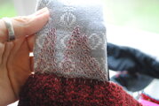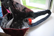 えんじ色のセーターを仕様。持ち手のフチ部分につららが上ってくるようにビーズを飾りました。