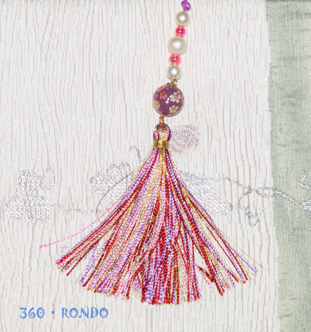 繊細な桜の花模様の「丸玉」に、日本手毬用の光沢ある糸で作って房飾りが揺れる愛らしい帯飾りです♪