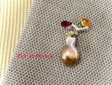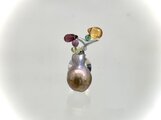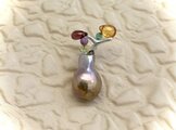 有核の淡水真珠の一部をカット、花瓶の形にピンときました。ガーネットのお花を活けて、カラフルな天然石やあこやケシも添え、個性的な仕上がりに。胸元にユニークな生け花のピンブローチ、可愛く決まること間違いなしです。