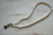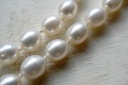 長さ8mm程度のライス型のパールをシルク糸で結びながらつなげていったネックレスです。ふっくらとして艶やかなパールです。