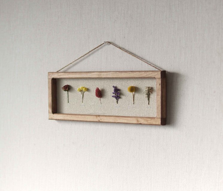 アンティーク調に仕上げた自家製フレームにドライフラワー等を標本風に貼り付けました。