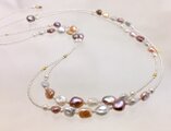 選り抜きのケシ真珠を使って陽だまりのように明るく暖かく心地良いツインネックレスを作ってみました。67.5+53.5=121cmの2本組みなので使い方いろいろ。洋服に合わせて楽しめます。